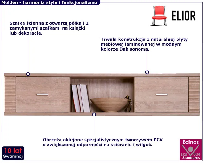Kolekcja Molden od Edinos Premium to zaproszenie do stworzenia wnętrza, w którym dominuje spokój, harmonia i bliskość natury. Niezależnie od tego, czy aranżujesz salon, sypialnię, czy gabinet - Molden wprowadzi do Twojego domu ciepło natury i nowoczesny design. Nie czekaj, zamów jeszcze dziś szafkę ścienną Donet 24X, a dostaniesz ją w atrakcyjnej cenie 568 zł. Postaw na minimalizm, który inspiruje, funkcjonalność, która ułatwia życie i styl, który pozostaje ponadczasowy. Postaw na szafkę Donet 24X już teraz!