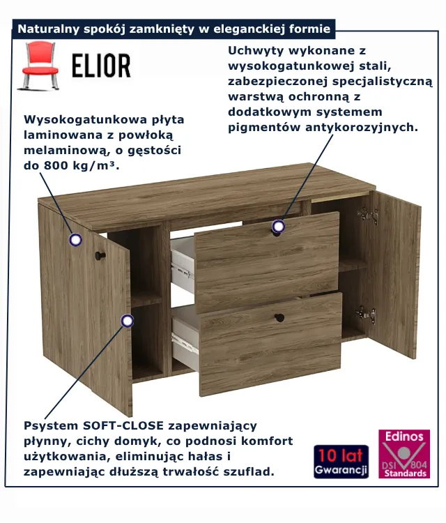 • Produkt posiada certyfikat jakości "Edinos Standards DSI 804", który potwierdza najwyższą jakość wykonania mebla oraz pełny stopień zgodności poszczególnych jednostek wytworzonego wyrobu z przyjętym wzorcem.