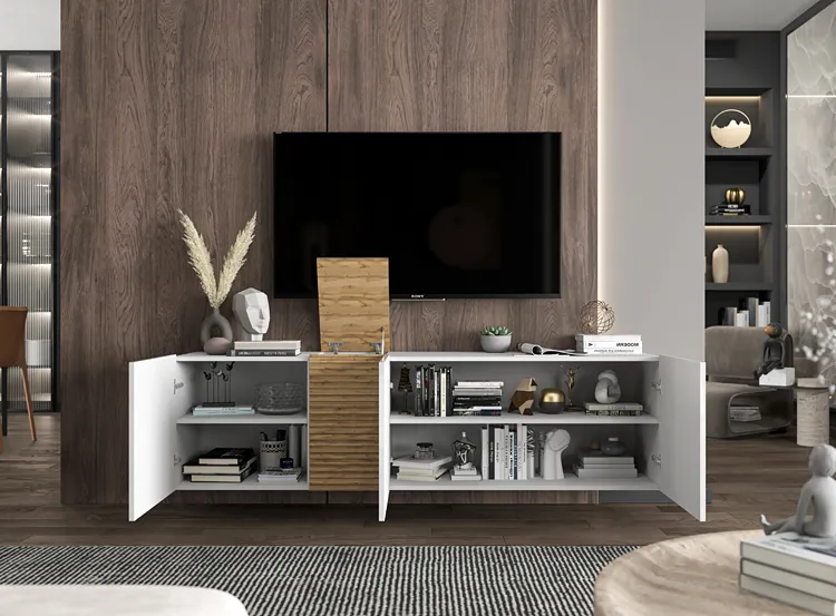 5. Praktyczne półki oraz schowek ukryty za stylowym frezowanym dekorem.