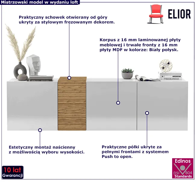 • Produkt posiada certyfikat jakości "Edinos Standards DSI 804", który potwierdza najwyższą jakość wykonania mebla oraz pełny stopień zgodności poszczególnych jednostek wytworzonego wyrobu z przyjętym wzorcem.