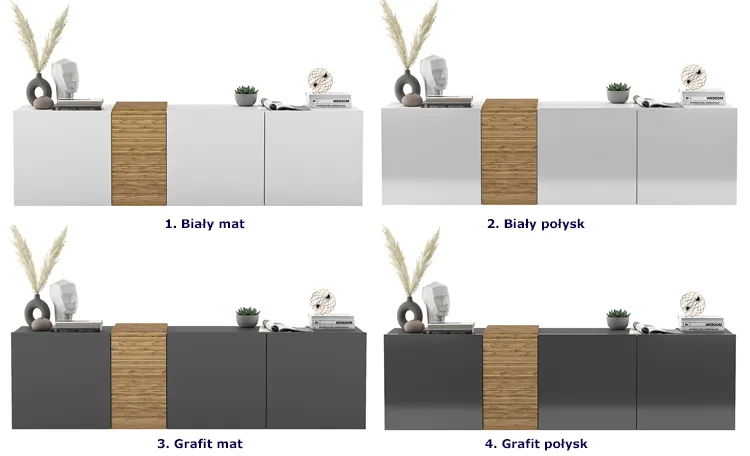 4 modne wariany kolorystyczne: biały mat, biały połysk, grafit mat, grafit połysk. Kliknij link i wybierz swój ulubiony!
