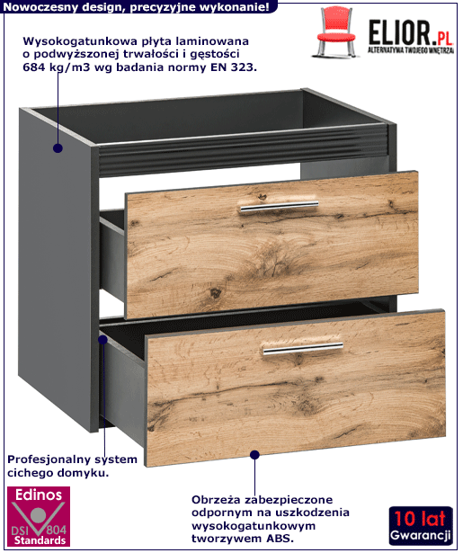 • Kolor: Antracyt + Dąb Wotan. Sprawdź także inne nowoczesne szafki łazienkowe w sklepie Edinos.pl. Stwórz swój praktyczny zestaw mebli.