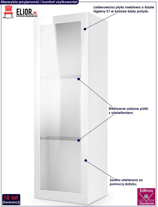 Designerska wisząca witryna RTV Vitoria 10X wyróżnia się nie tylko swoją praktyczną formą i eleganckim kształtem, ale także zastosowaniem materiałów najlepszej jakości. To dlatego cieszy się powodzeniem wśród osób lubiących nowatorskie rozwiązania. Użyta do produkcji frontów szafki lakierowana płyta meblowa w kolorze biały połysk została uszlachetniona cienkimi filmami melaminowymi. Posiada także specjalne włókna ułożone różnokierunkowo o strukturze sinusoidalnej, co zapewnia nadanie jej cech jakościowych oraz wytrzymałościowych. Zastosowana technologia sprzyja utrzymywaniu mebla w czystości. Korpus mebla w kolorze biały mat wyprodukowano z płyty laminowanej o podwyższonej trwałości i gęstości. Efektowną witrynę wyprodukowano z podwójnie hartowanego szkła, dzięki czemu jest całkowicie odporna na rysy i uszkodzenia. Oświetlenie LED w czterech stonowanych barwach do wyboru, jest doskonałym źródłem spokojnego, nocnego światła. Subtelnie rozjaśnia meble, nie powodując przy tym przykrego odczucia bolących oczu. Drzwiczki z systemem push-click (szafka nie posiada uchwytów - otwierana jest za pomocą dotyku) gwarantują Ci niezwykle funkcjonalne korzystanie z mebla. Trzy półki są niezwykle praktyczne i pozwalają na ustawienie np. ramek ze zdjęciami czy innych dekoracji bez narażania ich na pokrycie kurzem czy upadek z wysokości. Stonowana kolorystyka i prosta forma sprawiają, że witryna wisząca Vitoria 10X doskonale sprawdza się we wnętrzach urządzonych w stylu minimalistycznym czy nowoczesnym. Nadaj Twojemu wnętrzu wyrazistego designu, harmonizując go z czystością prawdziwej bieli!