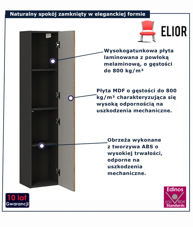 • Produkt posiada certyfikat jakości "Edinos Standards DSI 804", który potwierdza najwyższą jakość wykonania mebla oraz pełny stopień zgodności poszczególnych jednostek wytworzonego wyrobu z przyjętym wzorcem.