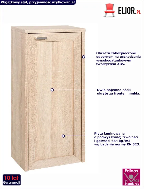 Marzysz o eleganckiej łazience w której panuje ład i harmonia? Wiszący półsłupek łazienkowy Bovo 6X to doskonały mebel wyróżniający się szeregiem zalet. Dwie pojemne półki ukryte za frontem szafki pozwolą Ci w dyskretny sposób uporządkować wszystko co choć potrzebne w zasięgu ręki lepiej by było niewidoczne dla oczu. Delikatna forma mebla nie przytłoczy wizualnie wnętrza, a ponadczasowa kolorystyka doskonale wkomponuje się w każde wnętrze. Szafka powstała z naturalnej płyty meblowej zbudowanej z włókien drzewnych i związków organicznych w warunkach wysokiego ciśnienia i temperatury. Włókna ułożone są różnokierunkowo, o strukturze sinusoidalnej, co zapewnia nadanie jej cech jakościowych oraz wytrzymałościowych. Dodatkowo płyta została uszlachetniona cienkimi filmami melaminowymi w celu zwiększenia jej trwałości. Dzięki temu masz pewność, że mebel ten posłuży Ci bez uszkodzeń przez wiele lat!