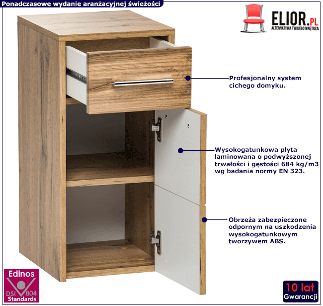 • Produkt posiada certyfikat jakości "Edinos Standards DSI 804", który potwierdza najwyższą jakość wykonania mebla oraz pełny stopień zgodności poszczególnych jednostek wytworzonego wyrobu z przyjętym wzorcem.