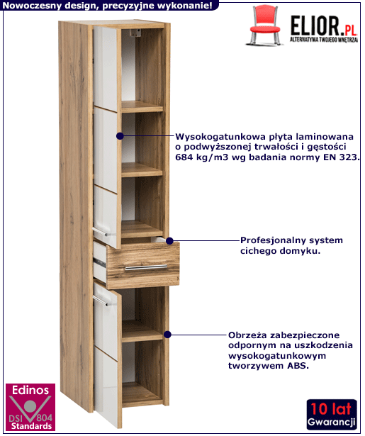 • Kolor: Dąb Wotan + Biały połysk. Sprawdź także inne nowoczesne szafki łazienkowe w sklepie Edinos.pl. Stwórz swój praktyczny zestaw mebli.