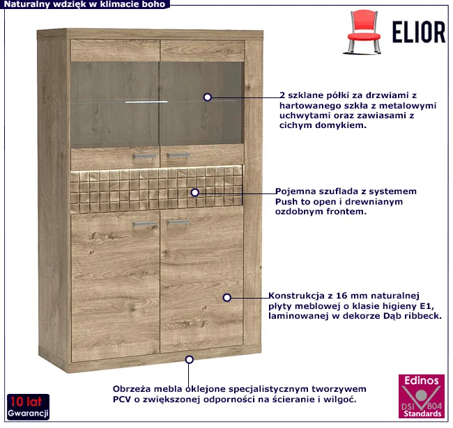 Witrynę Leticia 7X zrobiliśmy z najwyższej jakości 16 mm laminowanej płyty meblowej o klasie higieny E1. Płyta charakteryzuje się ciekawą strukturą, która idealnie odwzorowuje naturalną fakturę i usłojenie drewna. Brzegi mebla zostały precyzyjnie oklejone specjalistycznym tworzywem PCV o zwiększonej odporności na ścieranie i wilgoć. Dekoracyjny akcent w postaci naturalnej sosnowej listwy rzeźbionej w przestrzenny wzór kratki fenomenalnie podnosi walory dekoracyjne mebla. A dodatkowa opcja oświetlenia LED subtelnie wyeksponuje oryginalny dekor. Uchylne drzwi górnej i dolnej części wyposażone w system cichego domyku Blumer 4X Plus, otwierają i zamykają się lekko i bezszelestnie. Górna część witryny posiada szklaną półkę na dekoracje zamkniętą za frontem z hartowanego szkła. Znajdująca się w środkowej części głęboka szuflada wyposażona w mechanizm "push to open" otwiera się po lekkim naciśnięciu frontu w odpowiednim miejscu, gwarantując natychmiastowy dostęp do zawartości. W dolnej części mebla znajduje się praktyczna szafka z półką ukrytą za pełnym frontem. Tak wykonana witryna Leticia 7X marki Edinos Premium świetnie sprawdzi się w salonie, jadalni lub gabinecie zapewniając nie tylko sporo miejsca do przechowywania, ale także fenomenalnie dekorując wnętrze.