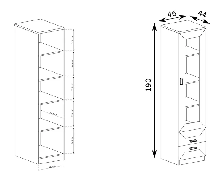 - Wymiary całkowite: wysokość: 190 cm, szerokość: 46 cm, głębokość: 44 cm.