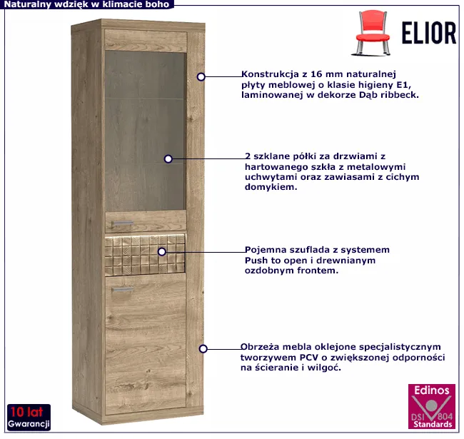 Witrynę Leticia 6X zrobiliśmy z najwyższej jakości 16 mm laminowanej płyty meblowej o klasie higieny E1. Płyta charakteryzuje się ciekawą strukturą, która idealnie odwzorowuje naturalną fakturę i usłojenie drewna. Brzegi mebla zostały precyzyjnie oklejone specjalistycznym tworzywem PCV o zwiększonej odporności na ścieranie i wilgoć. Dekoracyjny akcent w postaci naturalnej sosnowej listwy rzeźbionej w przestrzenny wzór kratki fenomenalnie podnosi walory dekoracyjne mebla. A dodatkowa opcja oświetlenia LED subtelnie wyeksponuje oryginalny dekor. Uchylne drzwi górnej i dolnej części wyposażone w system cichego domyku Blumer 4X Plus, otwierają i zamykają się lekko i bezszelestnie. Górna część witryny posiada 2 szklane półki na dekoracje zamknięte za frontem z hartowanego szkła. Znajdująca się w środkowej części głęboka szuflada wyposażona w mechanizm "push to open" otwiera się po lekkim naciśnięciu frontu w odpowiednim miejscu, gwarantując natychmiastowy dostęp do zawartości. W dolnej części mebla znajduje się praktyczna szafka z półką ukrytą za pełnym frontem. Tak wykonana witryna Leticia 6X marki Edinos Premium świetnie sprawdzi się w salonie, jadalni lub gabinecie zapewniając nie tylko sporo miejsca do przechowywania, ale także fenomenalnie dekorując wnętrze.
