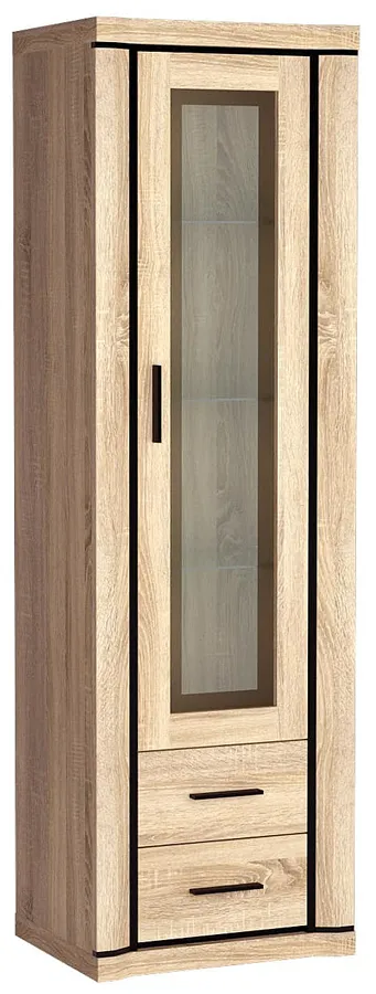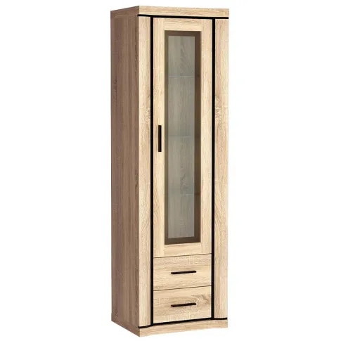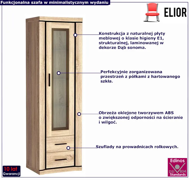 Witrynę Rectano 18X zrobiliśmy z najwyższej jakości 16 mm laminowanej płyty meblowej o klasie higieny E1. Płyta charakteryzuje się ciekawą strukturą, która idealnie odwzorowuje naturalną fakturę i usłojenie drewna. Dla podniesienia efektu dekoracyjnego brzegi mebla ozdobiliśmy szprosami w kolorze czarnym, które subtelnie podkreślają szlachetne wybarwienie dębu sonoma. Obrzeża witryny zostały precyzyjnie oklejone specjalistycznym tworzywem ABS o zwiększonej odporności na ścieranie i wilgoć. Drzwi zamontowane na trwałych zawiasach są otwierane uchylnie za pomocą stylowych uchwytów z trwałego metalu. Przestronne wnętrze witryny zostało zorganizowane w funkcjonalny sposób. W dolnej części znajdują się 2 pojemne szuflady na prowadnicach rolkowych. Górną część stanowi przeszklona witryna z 3 stabilnymi półkami z hartowanego szkła. Witryna doskonale nadaje się do przechowywania naczyń, porcelany lub dekoracji. Przeszklenia powodują, że mebel sprawia wrażenie lekkiego, nie przytłacza wizualnie wnętrza i nadaje mu aury wytwornej elegancji. Tak zaprojektowana witryna Rectano 18X marki Edinos Premium to fantastyczny pomysł na przechowywanie i niesztampową aranżację salonu lub jadalni!