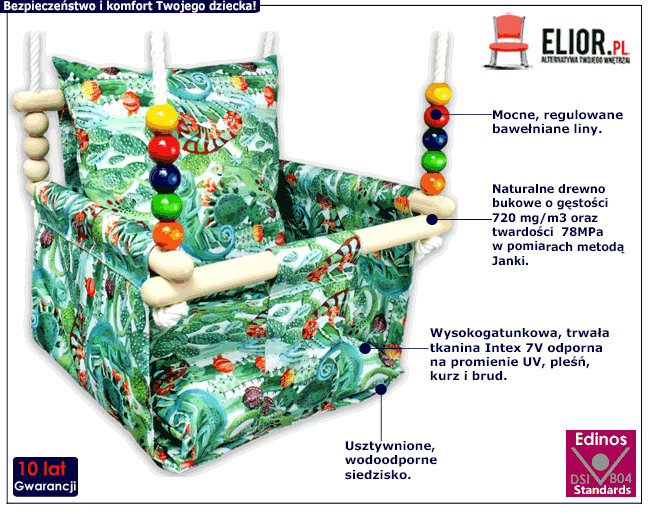 Surowce, z jakich powstała huśtawka Rukva są przyjazne i bezpieczne dla Twojego dziecka. Konstrukcję tworzy naturalne drewno bukowe. Jest niezwykle trwałe i odporne na wszelkiego rodzaju uszkodzenia. Charakteryzuje się wysoką gęstością (720 mg/m3) oraz wyjątkowo dużą twardością - aż 78 MPa w pomiarach metodą Janki. Materiał pokrywający huśtawkę to wodoodporna tkanina Intex 7V. Wyróżnia się wysoką odpornością na warunki atmosferyczne, a zwłaszcza promienie UV. Jest także niezwykle wytrzymała na nacisk i rozciąganie. Warstwa vinylu ogranicza przyleganie kurzu, brudu czy pleśni, nawet w najbardziej skrajnych warunkach pogodowych. Tkanina ta nie wchłania wilgoci i szybko schnie. Wnętrze poduszek wypełniliśmy antyalergiczną, oddychającą kulką silikonową, która nie odkształca się podczas użytkowania. Wszystkie wykorzystane surowce oraz precyzja wykonania są gwarantem długiego i bezpiecznego użytkowania huśtawki Rukva!