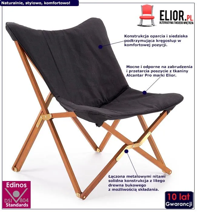 Fotel Morris wyróżnia się nie tylko charakterystyczną formą, przypominającą nieco tzw. krzesło reżyserskie, ale także zastosowaniem materiałów najlepszej jakości. Mebel zaprojektowano z nauralnego drewna bukowego o właściwościach antystatycznych i antyalergicznych. Solidna konstrukcja krzyżakowych nóg złączonych metalowymi nitami została oparta na znanej od stuleci formie lekkiego przenośnego krzesła, przeznaczonego na tarasy, balkony i kempingi. Poszycie fotela w neutralnym ciemnopopielatym odcieniu skonstruowane z wysokiej jakości tkaniny Alcantar Pro, charakteryzującej się dużą odpornością na ścieranie i zabrudzenia oraz niezwykłą miękkością w dotyku (dzięki warstwie poliuretanu). Tkanina Alcantar Pro, która jako jedyna na rynku produkowana jest z dokładnie wyselekcjonowanych ultramikrowłókien o objętości aż do 24-razy drobniejszej od ludzkiego włosa, charakteryzuje się wyjątkową żywotnością, odpornością oraz niezwykłą łatwością w utrzymaniu. Posiada ponadprzeciętne cechy wytrzymałościowe, dzięki czemu nawet intensywne użytkowanie pozostawia tkaninę w doskonałym stanie. Tkanina Alcantar jest także bardzo praktyczna i można ją czyścić na mokro, dzięki czemu unikniesz co sezonowej wymiany tapicerki.