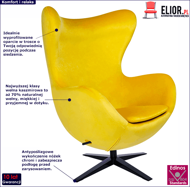 - Modna kolorystyka: tapicerka w kolorze żółtym i czarna podstawa. Kliknij w link i sprawdź także inne fotele typu uszak w sklepie Edinos.pl. Stwórz swój praktyczny zestaw mebli.
