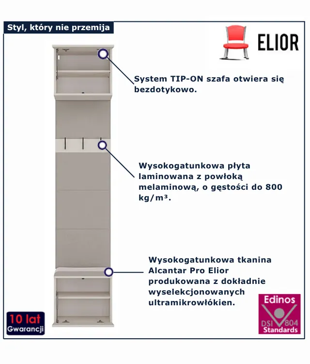 • Produkt posiada certyfikat jakości "Edinos Standards DSI 804", który potwierdza najwyższą jakość wykonania mebla oraz pełny stopień zgodności poszczególnych jednostek wytworzonego wyrobu z przyjętym wzorcem.