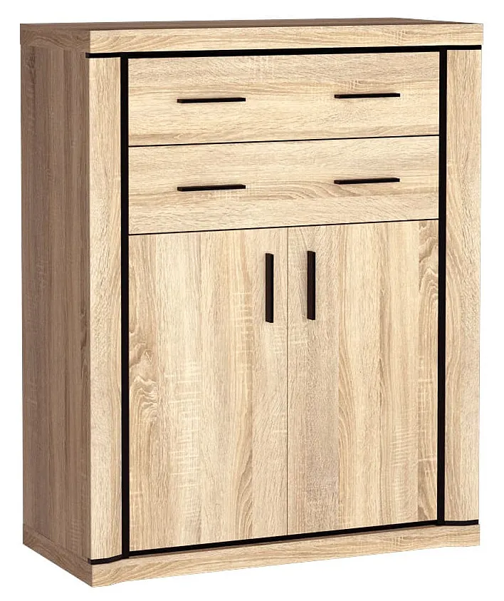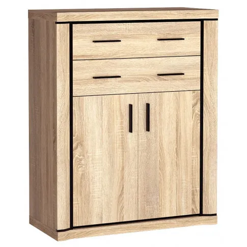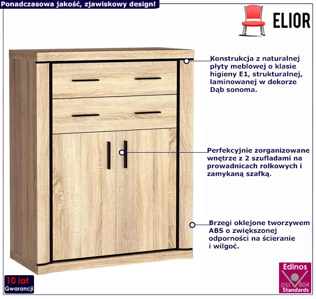 Komodę Rectano 8X zrobiliśmy z najwyższej jakości 16 mm laminowanej płyty meblowej o klasie higieny E1. Płyta charakteryzuje się ciekawą strukturą, która idealnie odwzorowuje naturalną fakturę i usłojenie drewna. Dla podniesienia efektu dekoracyjnego brzegi mebla ozdobiliśmy szprosami w kolorze czarnym, które subtelnie podkreślają szlachetne wybarwienie dębu sonoma. Brzegi komody zostały precyzyjnie oklejone specjalistycznym tworzywem ABS o zwiększonej odporności na ścieranie i wilgoć. Drzwi zamontowane na trwałych zawiasach są otwierane uchylnie za pomocą stylowych uchwytów z trwałego metalu. Przestronne wnętrze komody zostało zorganizowane w funkcjonalny sposób. W górnej części znajdują się 2 pojemne szuflady na prowadnicach rolkowych. Niżej umieściliśmy praktyczną szafkę z półką dzielącą wnętrze na pół. Szeroki blat o grubości 48 mm idealnie wyeksponuje ciekawe dekoracje i pamiątki rodzinne. Tak wykonana komoda Rectano 8X marki Edinos Premium to fantastyczny pomysł na przechowywanie i niesztampową aranżację wnętrza.
