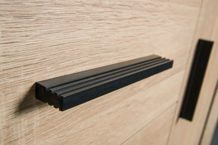 - Obrzeża klejone krzywoliniowo, zdobione efektownymi szprosami w kolorze czarnym.