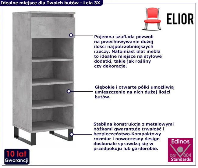• Kolor: Szarość betonu. W naszej ofercie posiadamy także inne nowoczesne szafki na buty. Kliknij i stwórz swój wyjątkowy zestaw mebli.