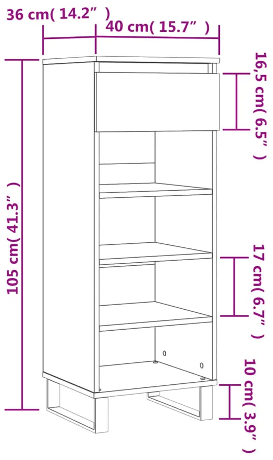 • Wymiary szafki na buty: wysokość 105 cm; szerokość 40 cm; głębokość 36 cm