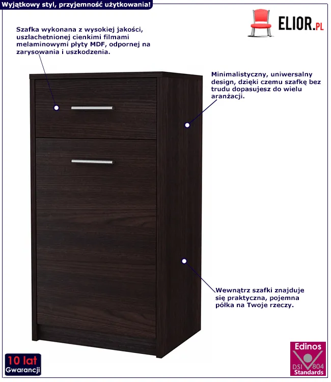 - Produkt posiada certyfikat jakości "Edinos Standards DSI 804", który potwierdza najwyższą jakość wykonania mebla oraz pełny stopień zgodności poszczególnych jednostek wytworzonego wyrobu z przyjętym wzorcem.
