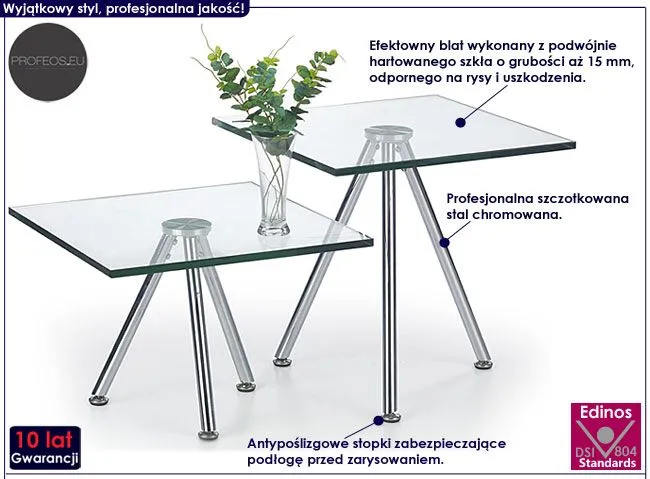 Komfortowa i efektowna ława Ifoter 3X wyróżnia się oryginalnym designem i dbałością o każdy detal mebla, a urok i nowoczesność, jak również mocna i solidna konstrukcja, dodają wiele użyteczności i wygody korzystania ze stolika. Efektowny kwadratowy blat wykonany został z podwójnie hartowanego szkła o grubości aż 15 mm, dzięki czemu jest on w pełni odporny na rysy i uszkodzenia. Profil stolika stworzony jest z najwyższej jakości stali chromowanej o zawartości aż stali nierdzewnej oraz chromu co gwarantuje mu niezwykły efekt wizualny, posiadając przy tym ponadprzeciętne cechy antykorozyjne oraz lepszą odporność na uszkodzenia mechaniczne . Ława Lexi dostępna jest w czterech praktycznych rozmiarach i kształtach, z łatwością więc wybierzesz tę, która najlepiej sprawdzi się w Twoich czterech kątach. Stonowana kolorystyka i prosta forma sprawiają, że stolik kawowy Profeos doskonale odnajduje się we wnętrzach urządzonych zarówno w stylu klasycznym, jak też minimalistycznym czy nowoczesnym. Ława dodaje wnętrzu harmonii i uroku, a każdy łyk kawy przy niej wypity pozwala Ci odetchnąć od codziennego zgiełku i pośpiechu. Nadaj Twojemu wnętrzu wyrazistego designu w modnym minimalistycznym stylu ze stolikiem kawowym Lexi!