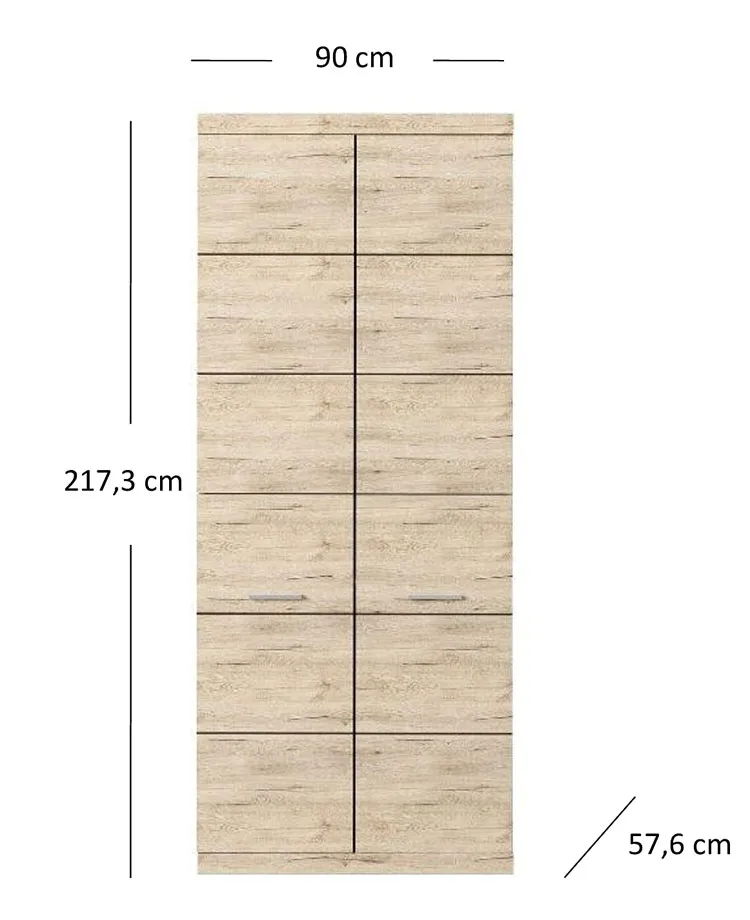 • Wymiary całkowite: szerokość: 90 cm, głębokość: 57,6 cm, wysokość: 217,3 cm.