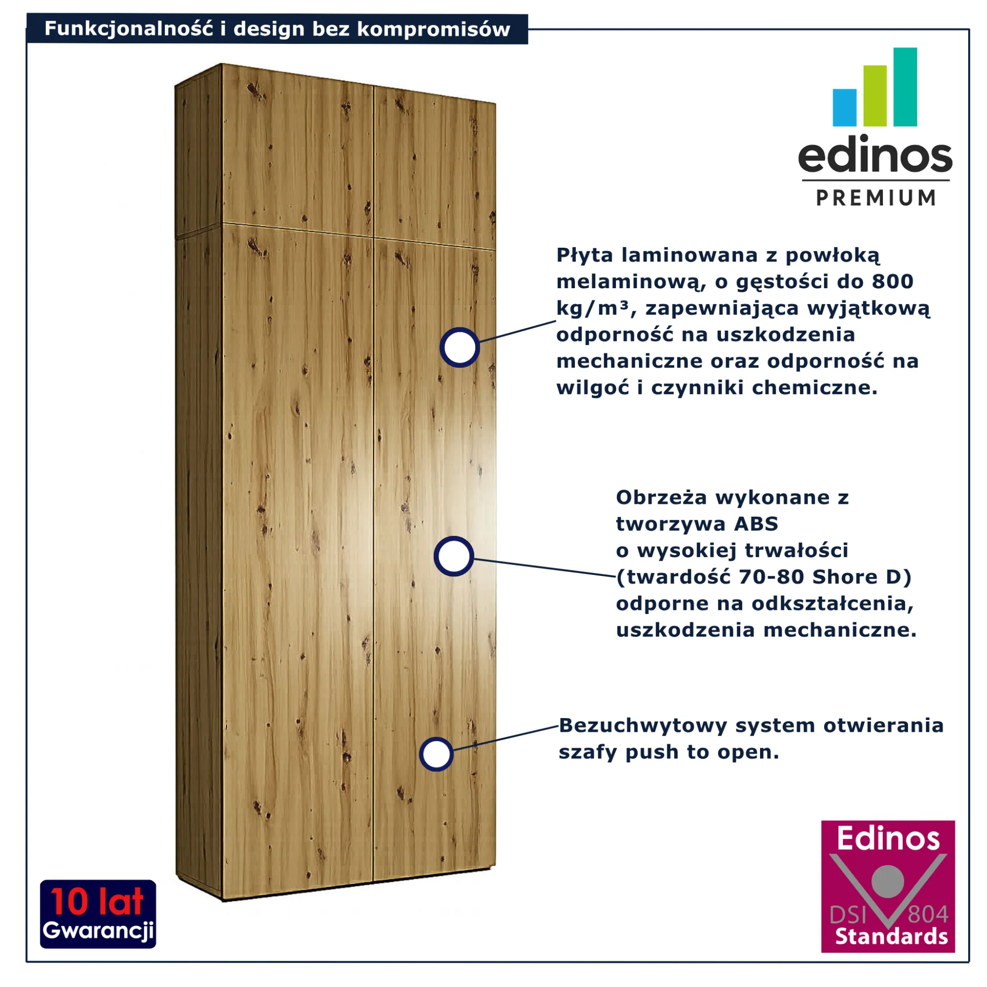 • Produkt posiada certyfikat jakości "Edinos Standards DSI 804", który potwierdza najwyższą jakość wykonania mebla oraz pełny stopień zgodności poszczególnych jednostek wytworzonego wyrobu z przyjętym wzorcem.