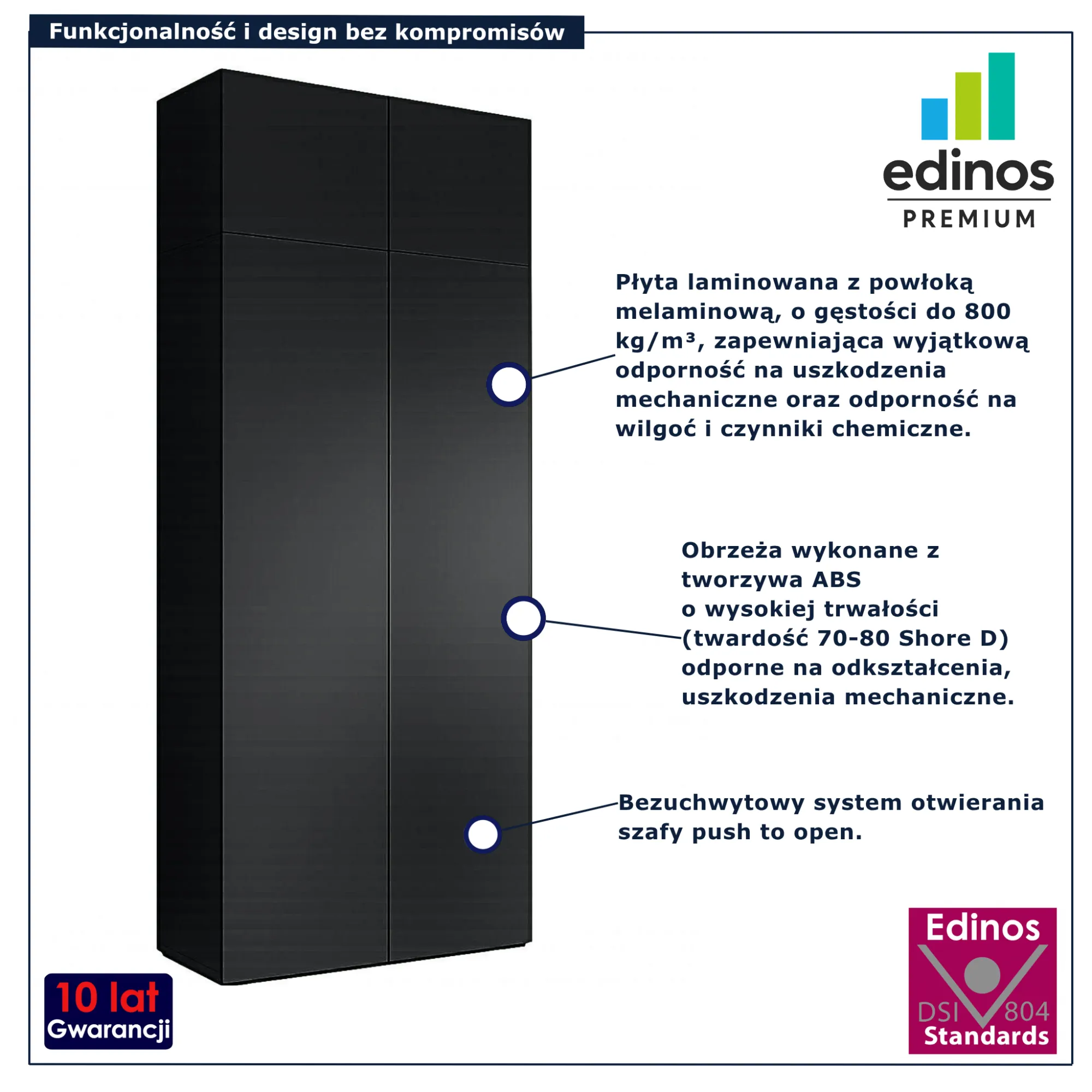 • Produkt posiada certyfikat jakości "Edinos Standards DSI 804", który potwierdza najwyższą jakość wykonania mebla oraz pełny stopień zgodności poszczególnych jednostek wytworzonego wyrobu z przyjętym wzorcem.