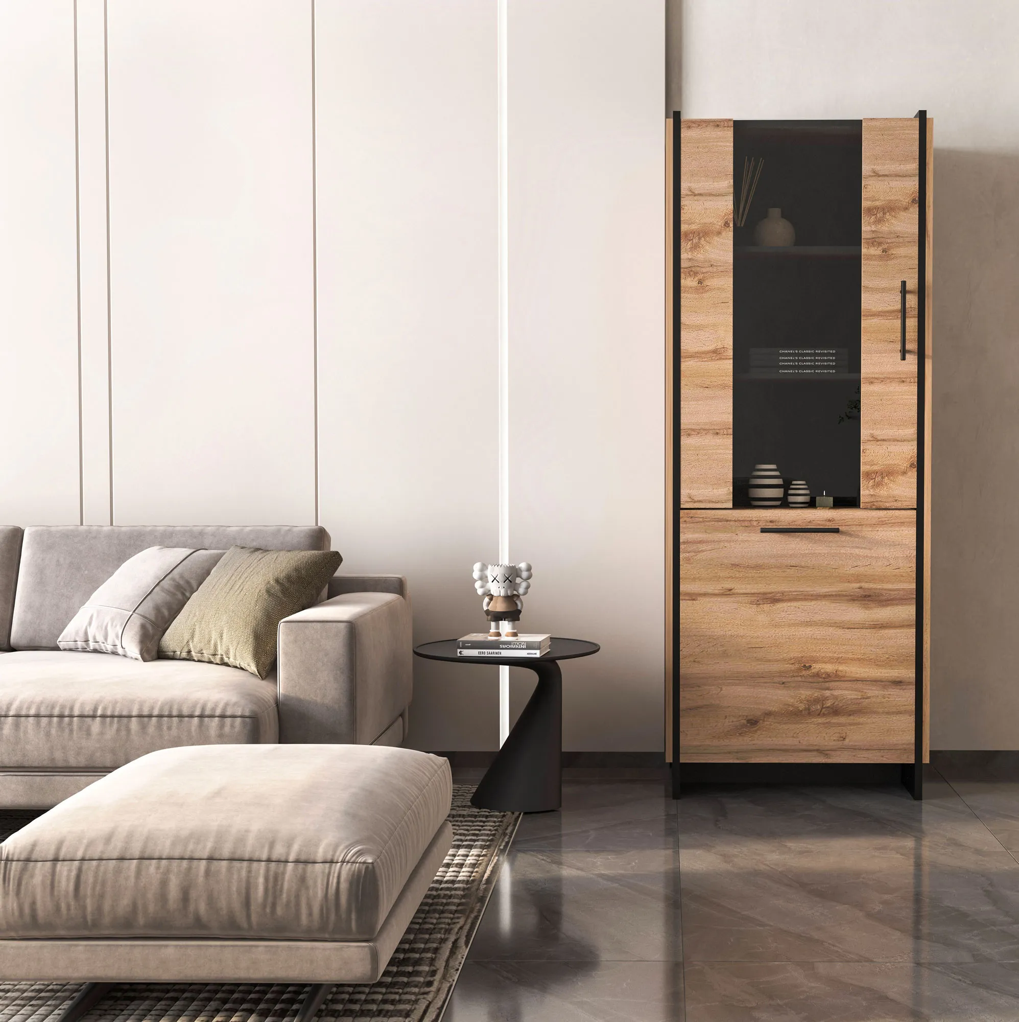 Wysoka witryna szklana do salonu Fellia 15X dąb wotan + czarny