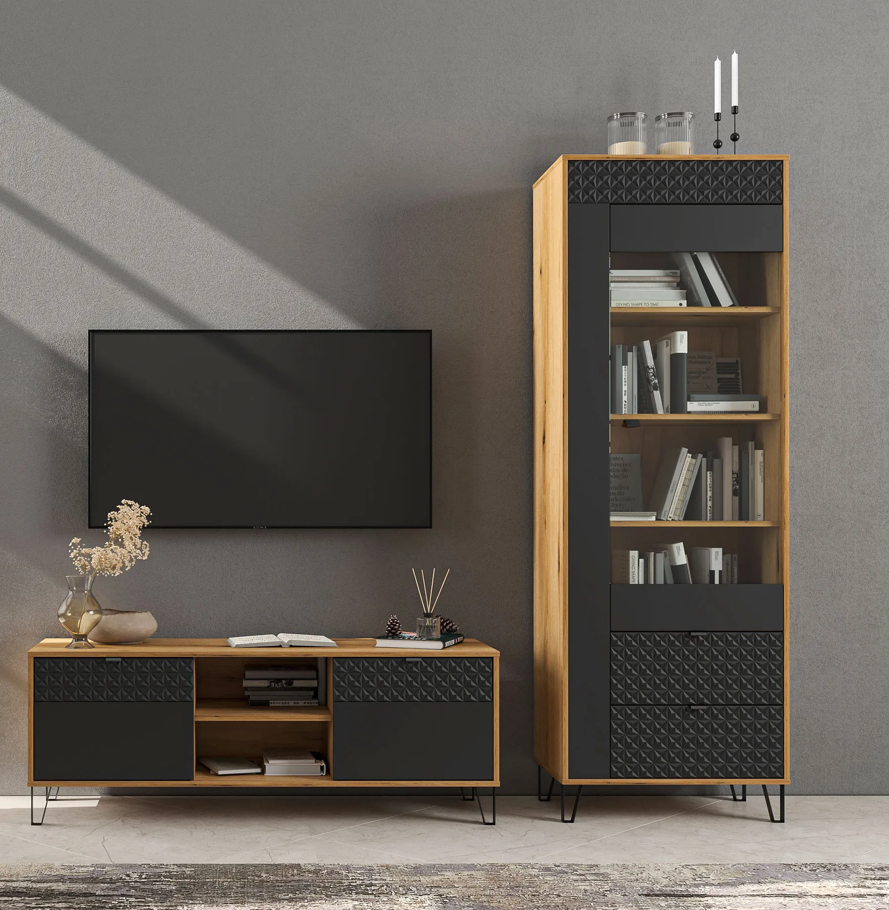 Salon z wykorzystaniem wysokiej witryny Eccio 12X dąb evok + czarny