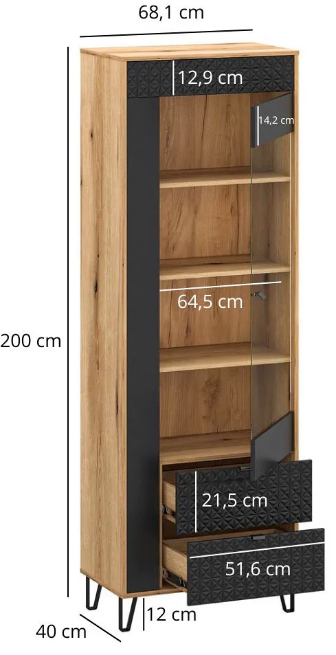 Witryna robi naprawdę duże wrażenie jest wysoka i smukła, a przeszklone drzwi fajnie eksponują dekoracje, książki czy szkło. Dąb + czarny ramy wyglądają elegancko i nowocześnie. Jedyne co to montaż wymagał dwóch osób ze względu na wysokość.
