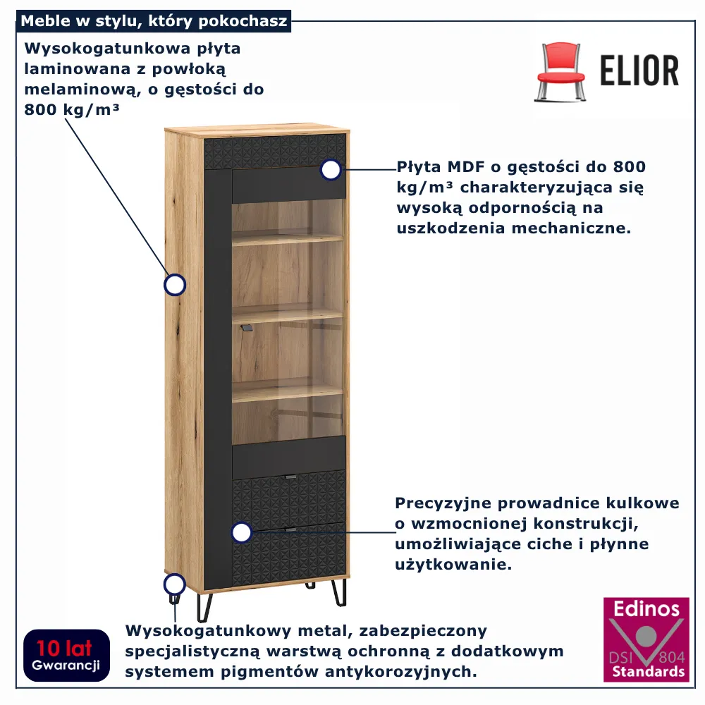 Witryna wysoka Eccio 12X marki Edinos Premium to mebel, który łączy w sobie praktyczność z subtelnym urokiem nowoczesnego wzornictwa. Dzięki przeszklonej części idealnie wyeksponujesz zastawę, dekoracje lub kolekcję ulubionych pamiątek, a dolne szuflady pozwolą Ci przechować wszystko to, co warto mieć pod ręką, lecz poza zasięgiem wzroku. To mebel, który doda Twojemu wnętrzu elegancji i uporządkowanej harmonii.