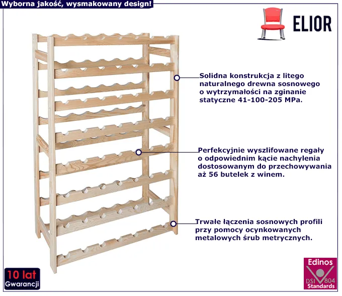 • Solidny regał z 8 leżniami przednimi i 8 tylnymi na 56 butelek z trunkami.