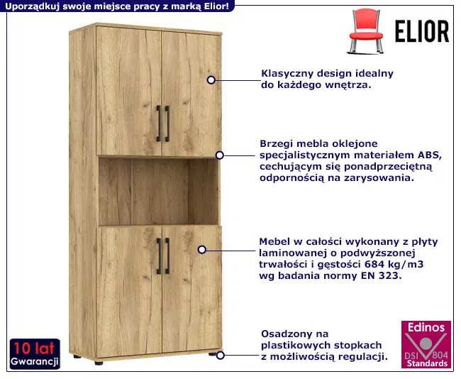 • Produkt posiada certyfikat jakości "Edinos Standards DSI 804", który potwierdza najwyższą jakość wykonania mebla oraz pełny stopień zgodności poszczególnych jednostek wytworzonego wyrobu z przyjętym wzorcem.