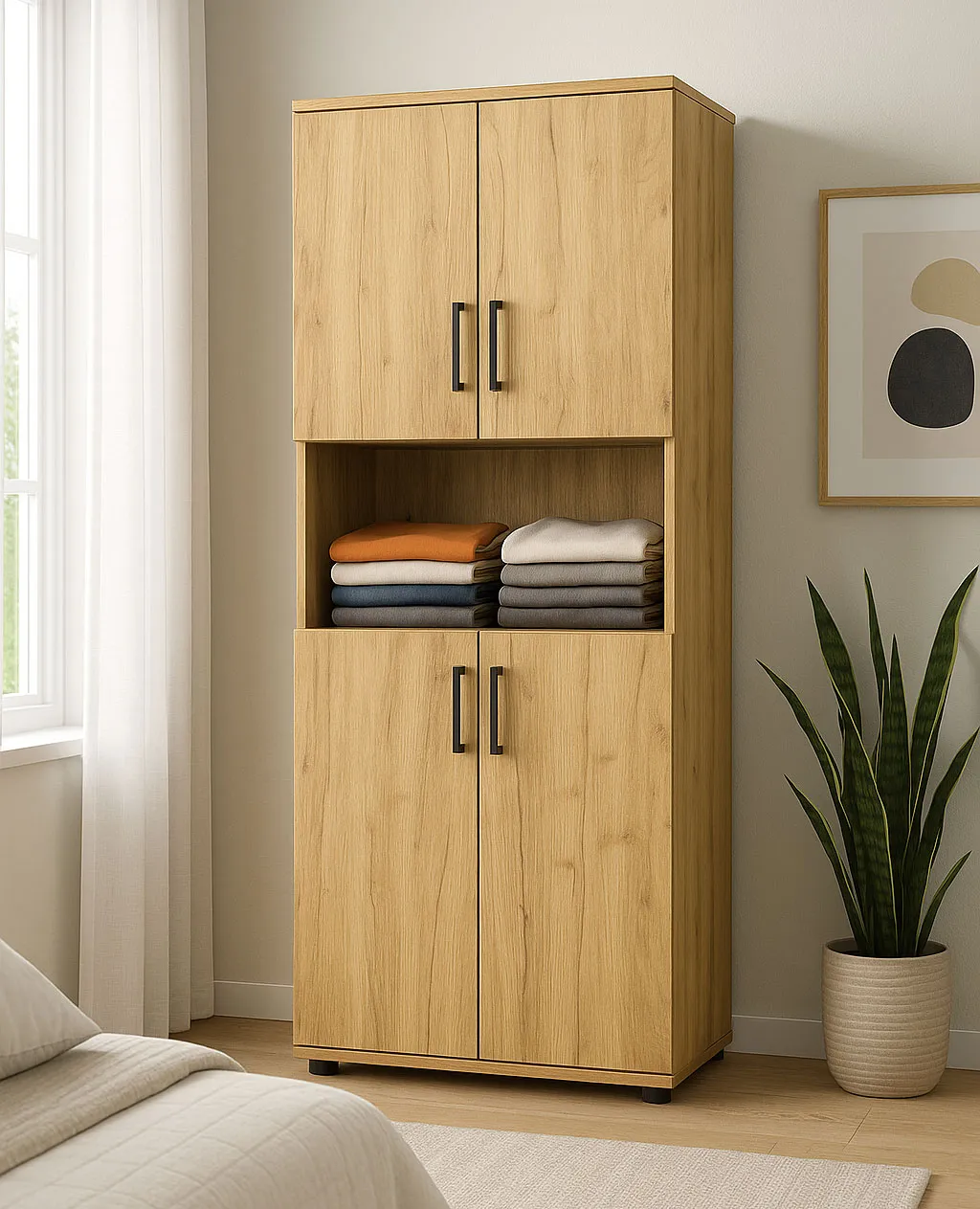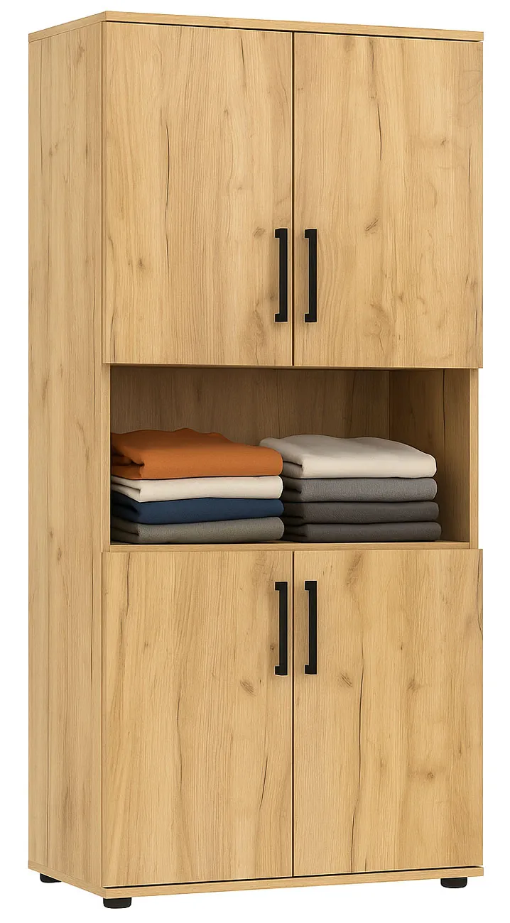 • Elastyczność: Otwarta środkowa półka zapewnia szybki dostęp do najczęściej używanych rzeczy — mogą to być złożone koszulki, swetry, czy nawet pojemnik z drobiazgami, po które sięgasz każdego dnia.