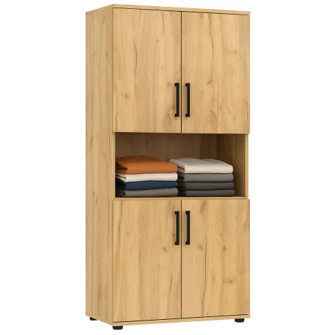 • Przestronność: Regał posiada 5 pojemnych półek (w tym jedną otwartą), które bez trudu pomieszczą wszystko, czego potrzebujesz w swojej garderobie — od swetrów, przez koszulki, po ręczniki i akcesoria.