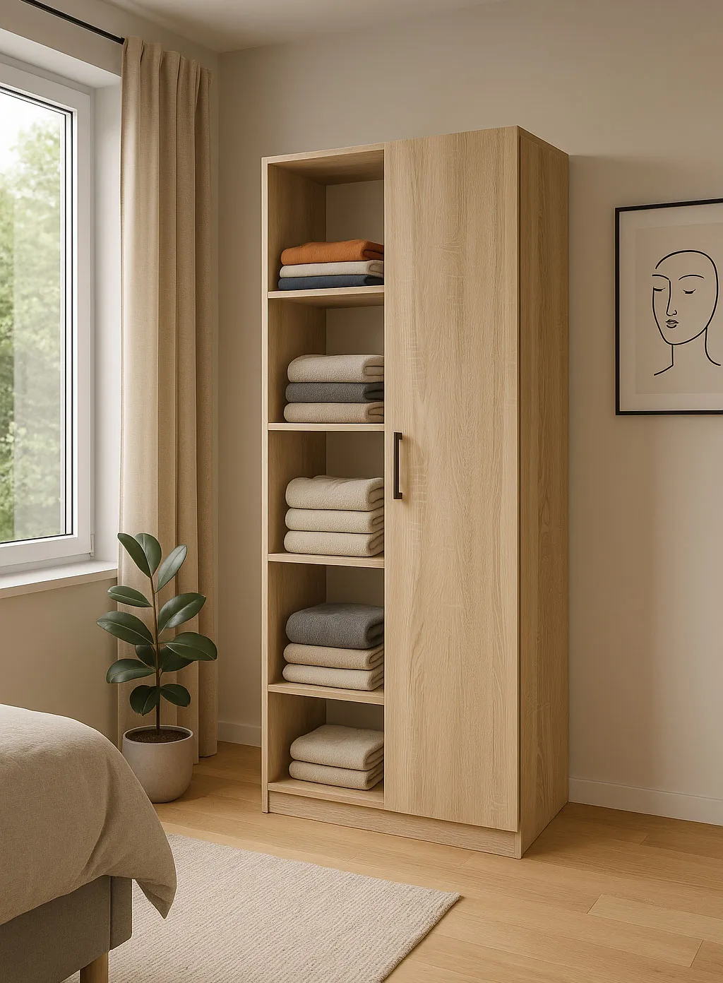 Regał ma schludny, minimalistyczny wygląd i sprawdza się doskonale w codziennym użytkowaniu. Wykończenie jest naturalne, a półki równe i dobrze się trzymają po zamontowaniu. Najbardziej podoba mi się to, że mogę przechowywać na nim zarówno tekstylia, jak i dekoracje i część schować za drzwiami, bo to daje dużo praktycznych możliwości.