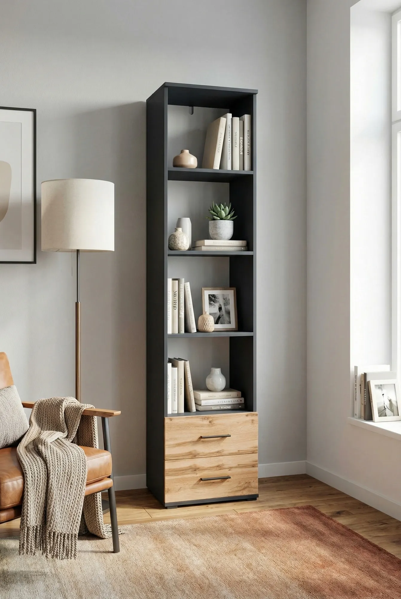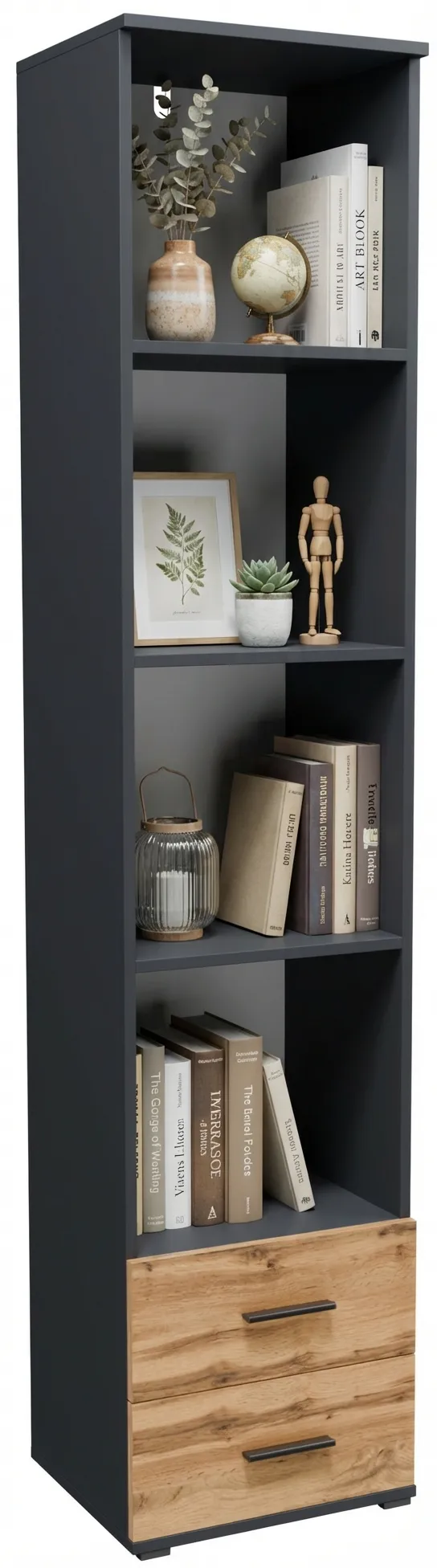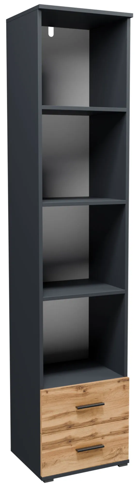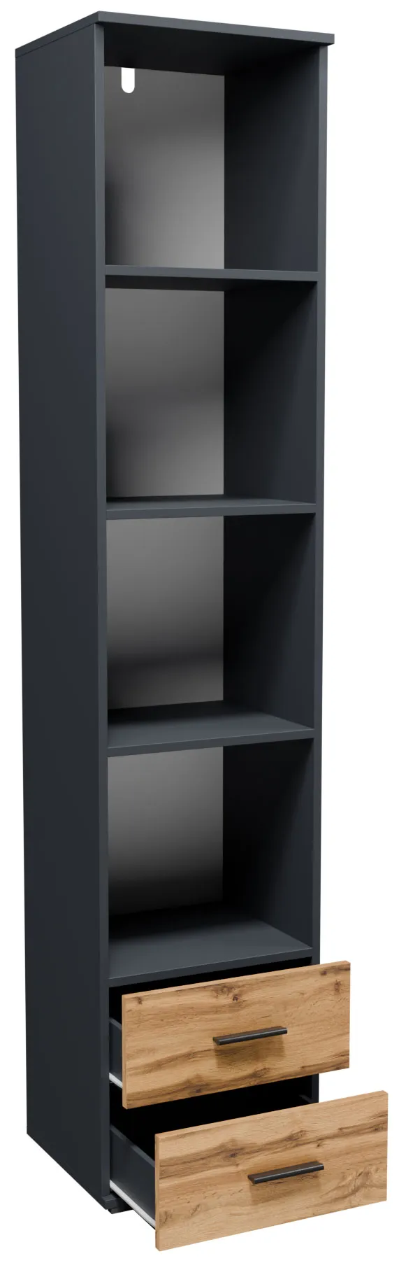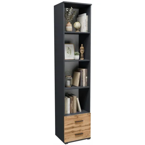 Wąski regał słupek z 2 szufladami Asendri 9X grafit + dąb wotan