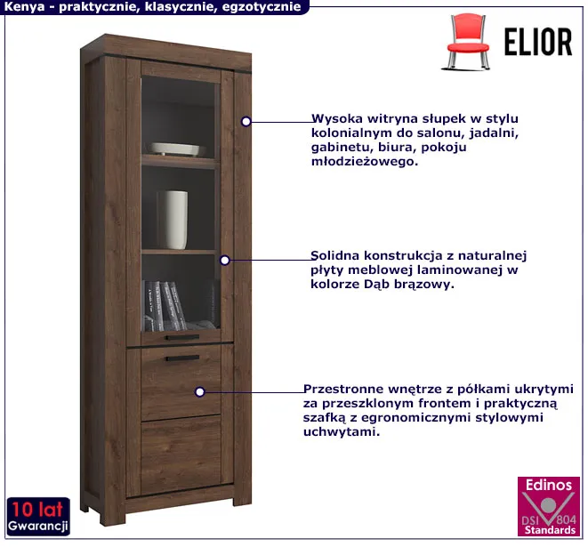 Kolekcja mebli Kenya od Elior to hołd dla klasycznej elegancji okraszonej szczyptą kolonialnej estetyki. Ten intrygujący miks stylistyczny został przez designerów Elior mistrzowsko zaadaptowany do wymagań współczesnych wnętrz. Solidna konstrukcja, ekologiczne materiały i maksymalny funkcjonalizm to bazowe zalety serii Kenya. Wisienką na torcie jest unikalne wzornictwo. Proste formy w barwach ciemnego dębu przywodzą na myśl kształty i kolory Afryki. Geometryczne uchwyty i ozdobne listwy w kolorze czerni podkreślają kolonialny charakter mebli, jednocześnie nadając im nutę nowoczesności. Kenya wyróżnia się szeroką gamą mebli, służących do aranżacji salonu, jadalni lub gabinetu pozwalając wykreować komfortową i unikalną przestrzeń. Oto kolejny model z tej zjawiskowej kolekcji - regał z witryną 14X!
