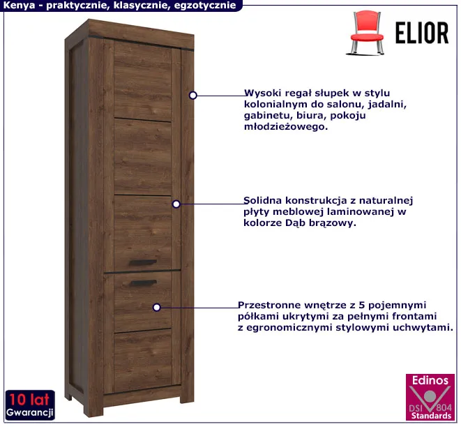 Kolekcja mebli Kenya od Elior to hołd dla klasycznej elegancji okraszonej szczyptą kolonialnej estetyki. Ten intrygujący miks stylistyczny został przez designerów Elior mistrzowsko zaadaptowany do wymagań współczesnych wnętrz. Solidna konstrukcja, ekologiczne materiały i maksymalny funkcjonalizm to bazowe zalety serii Kenya. Wisienką na torcie jest unikalne wzornictwo. Proste formy w barwach ciemnego dębu przywodzą na myśl kształty i kolory Afryki. Geometryczne uchwyty i ozdobne listwy w kolorze czerni podkreślają kolonialny charakter mebli, jednocześnie nadając im nutę nowoczesności. Kenya wyróżnia się szeroką gamą mebli, służących do aranżacji salonu, jadalni lub gabinetu pozwalając wykreować komfortową i unikalną przestrzeń. Oto kolejny model z tej zjawiskowej kolekcji - regał zamykany Samar 8X!