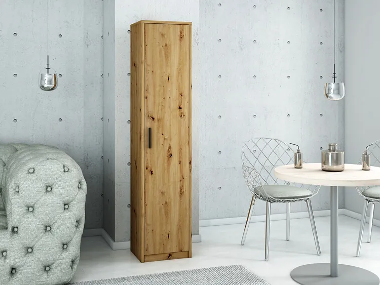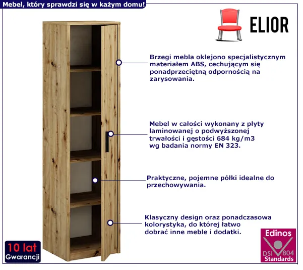 Marzysz o przestronnych pomieszczeniach? Nie lubisz nadmiaru mebli, które przytłaczają? Rewelacyjny regał Okles marki Edinos Premium to idealne rozwiązanie dla Ciebie. Zamykany wąski regał z czterema półkami świetnie pomieści rzeczy, które chcesz mieć pod ręką. Klasyczny design oraz stonowana kolorystyka to gwarancja, że idealnie wpasuje się do salonu, sypialni czy pokoju dziecka. Możliwości jego wykorzystania jest wiele, a ogranicza je jedynie Twoja wyobraźnia!