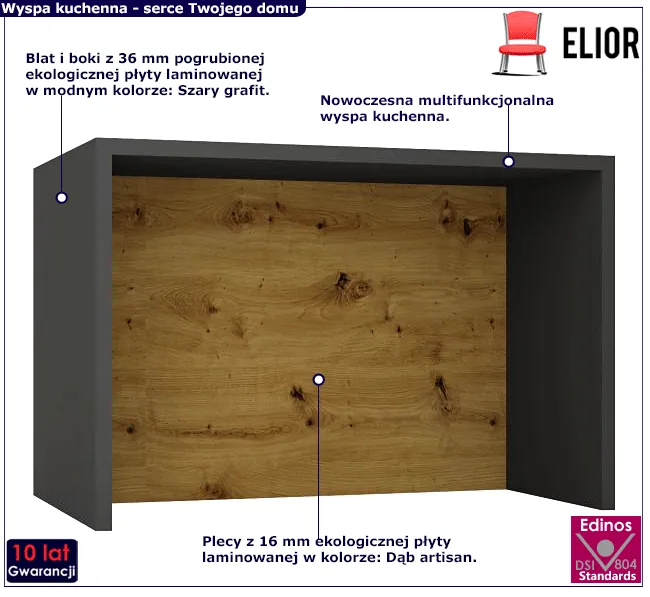 • Modny kolor: Szary grafit + dąb artisan. Szukasz innej wyspy kuchennej? Kliknij w link i sprawdź wyspy kuchenne w sklepie Edinos.pl. Stwórz własny praktyczny zestaw. Zamawiając produkty razem, oszczędzasz na współnej wysyłce.