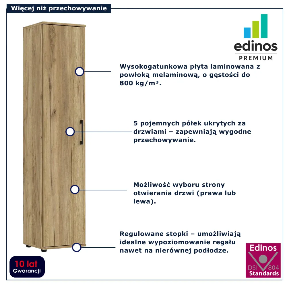 • Produkt posiada certyfikat jakości "Edinos Standards DSI 804", który potwierdza najwyższą jakość wykonania mebla oraz pełny stopień zgodności poszczególnych jednostek wytworzonego wyrobu z przyjętym wzorcem.