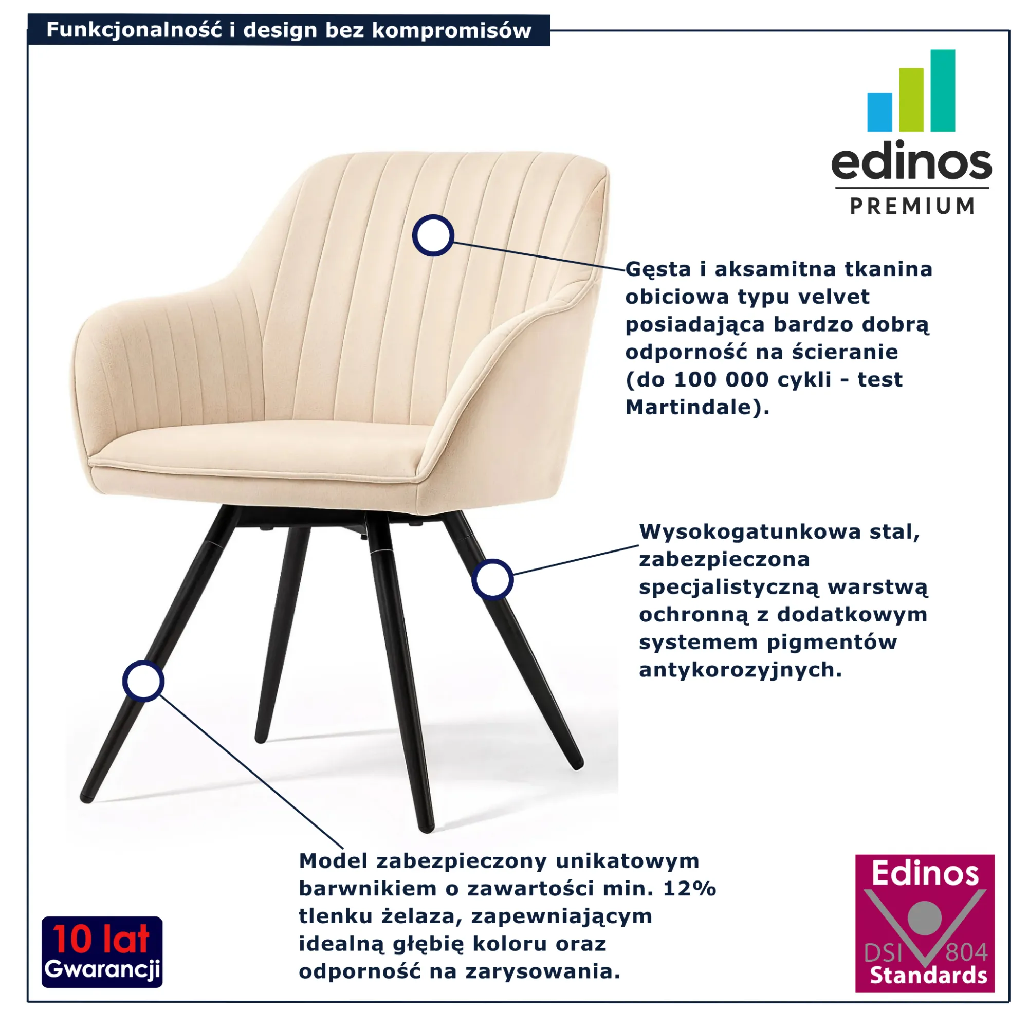 • Produkt posiada certyfikat jakości "Edinos Standards DSI 804", który potwierdza najwyższą jakość wykonania mebla oraz pełny stopień zgodności poszczególnych jednostek wytworzonego wyrobu z przyjętym wzorcem.