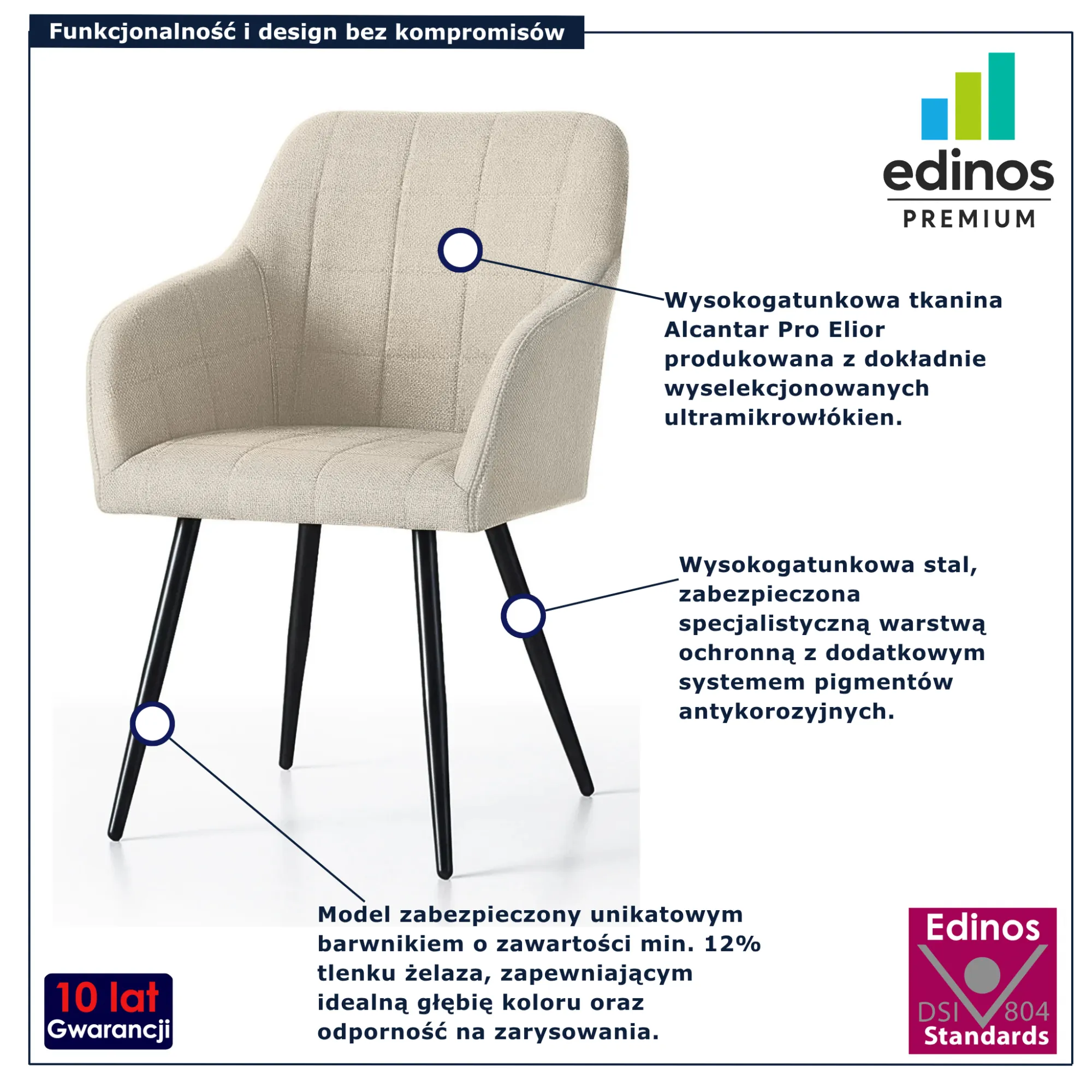 • Produkt posiada certyfikat jakości "Edinos Standards DSI 804", który potwierdza najwyższą jakość wykonania mebla oraz pełny stopień zgodności poszczególnych jednostek wytworzonego wyrobu z przyjętym wzorcem.