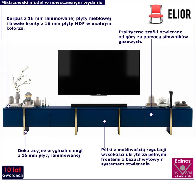 Szafka RTV Mosi 4X marki Edinos Premium to kwintesencja nowoczesnego designu, łącząca w sobie wymiar dekoracyjny i praktyczny. Eleganckie wzornictwo i funkcjonalizm użytkowy to kluczowe zalety tego modelu. Szlachetną geometrię formy podkreśla oryginalna rama o futurystycznych konotacjach. Precyzyjnie zaplanowane wnętrze z pojemnymi szafkami i półkami z możliwością regulacji zapewnia sporo miejsca do przechowywania. Modernistyczny design zestawiony z elegancką kolorystyką w 3 kolorach do wyboru idealnie wpisuje się w najnowsze trendy, tworząc stylowe wnętrze pełne unikalnego charakteru.