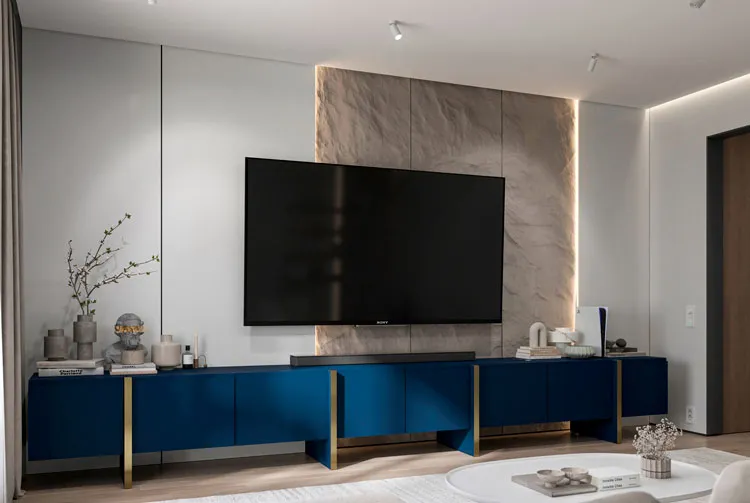 Salon w stylu glamour z wykorzystaniem zestawu 2 szafek RTV Mosi 4X granat