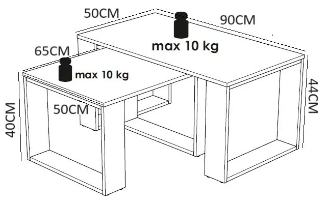 • Wymiary większego stolika: szerokość: 90 cm, głębokość: 50 cm, wysokość: 44 cm.