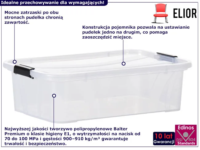 • Widoczna zawartość: Przezroczyste ścianki pozwalają na łatwą identyfikację przechowywanych przedmiotów.