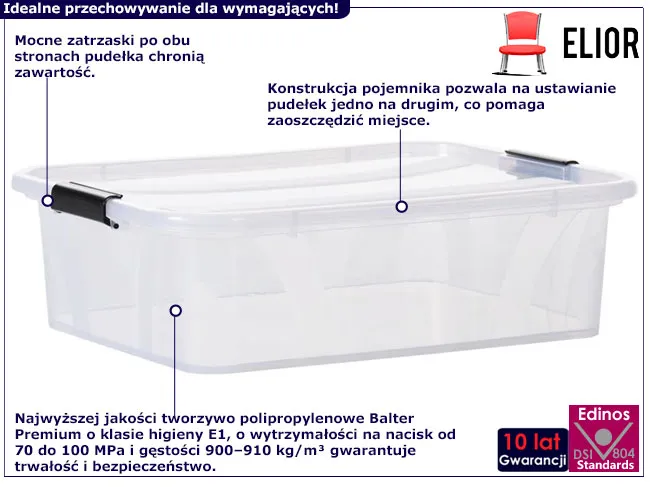 • Widoczna zawartość: Przezroczyste ścianki pozwalają na łatwą identyfikację przechowywanych przedmiotów.